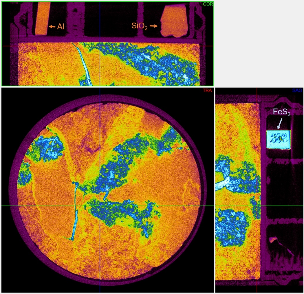 Рентген-устройство одновременно сканирует образец породы и эталонные объекты с известным химическим составом, что даёт возможность эффективнее изучать недра – строить точную шкалу измерений и буквально считывать характеристики минералов при последующей математической обработке трёхмерных изображений.